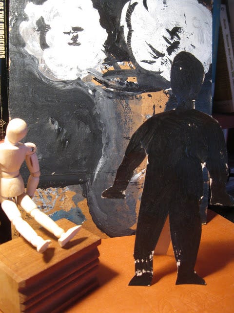 Moon Man. The first painting he made, when he did start seriously back to work, showed a balloon-like jostle of forty moons--blue, white and violet. He had taken it from a Kleenex Box.